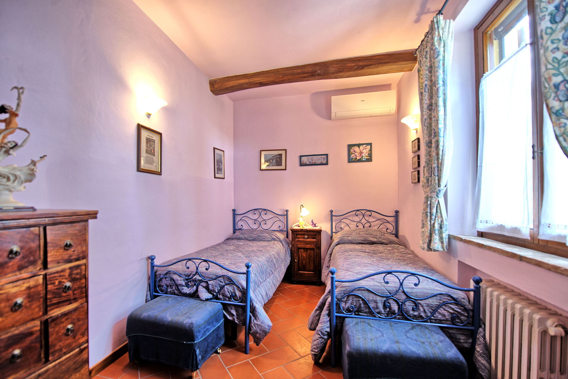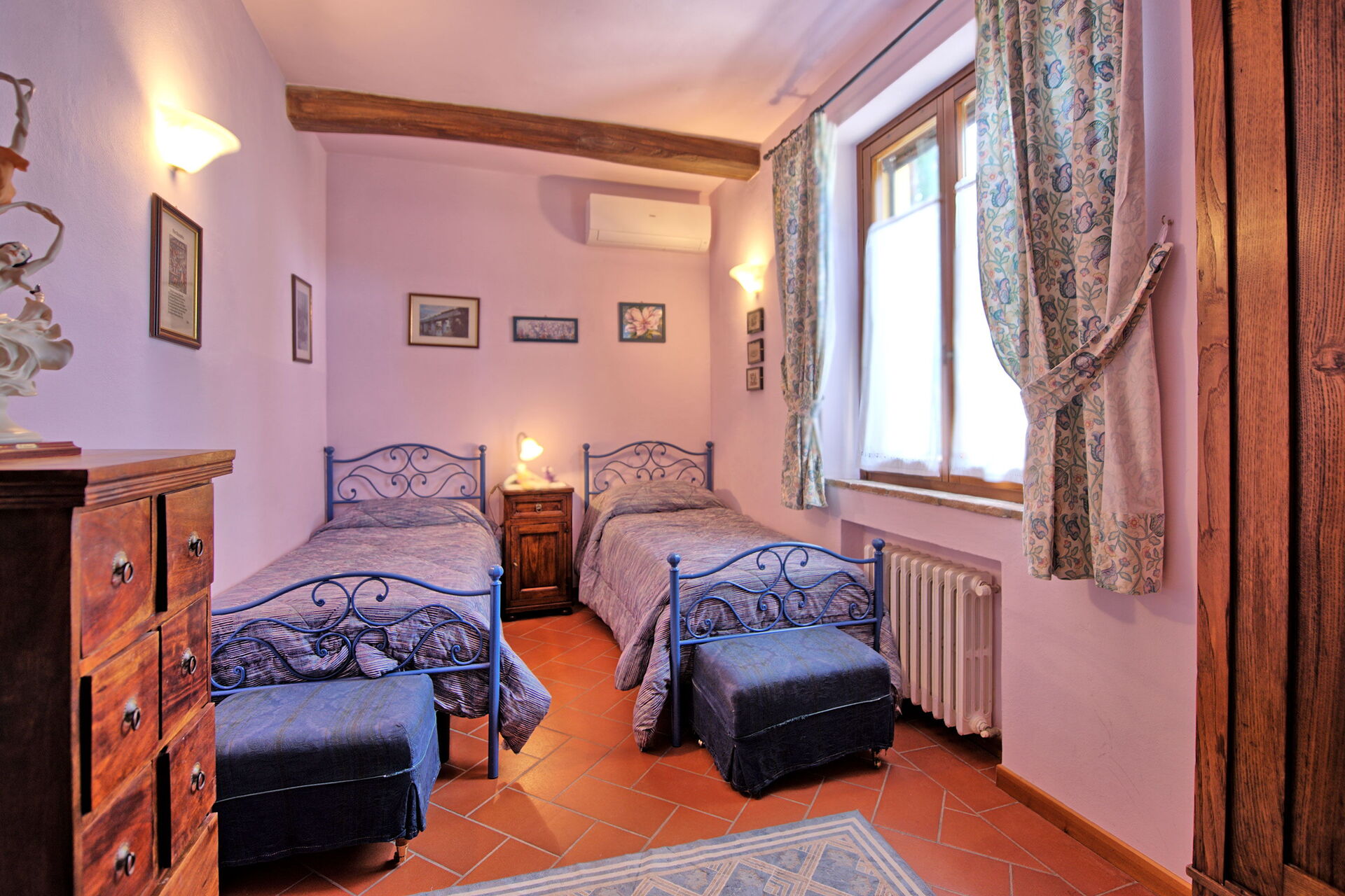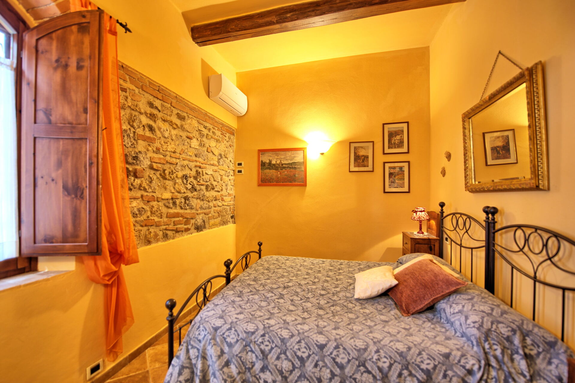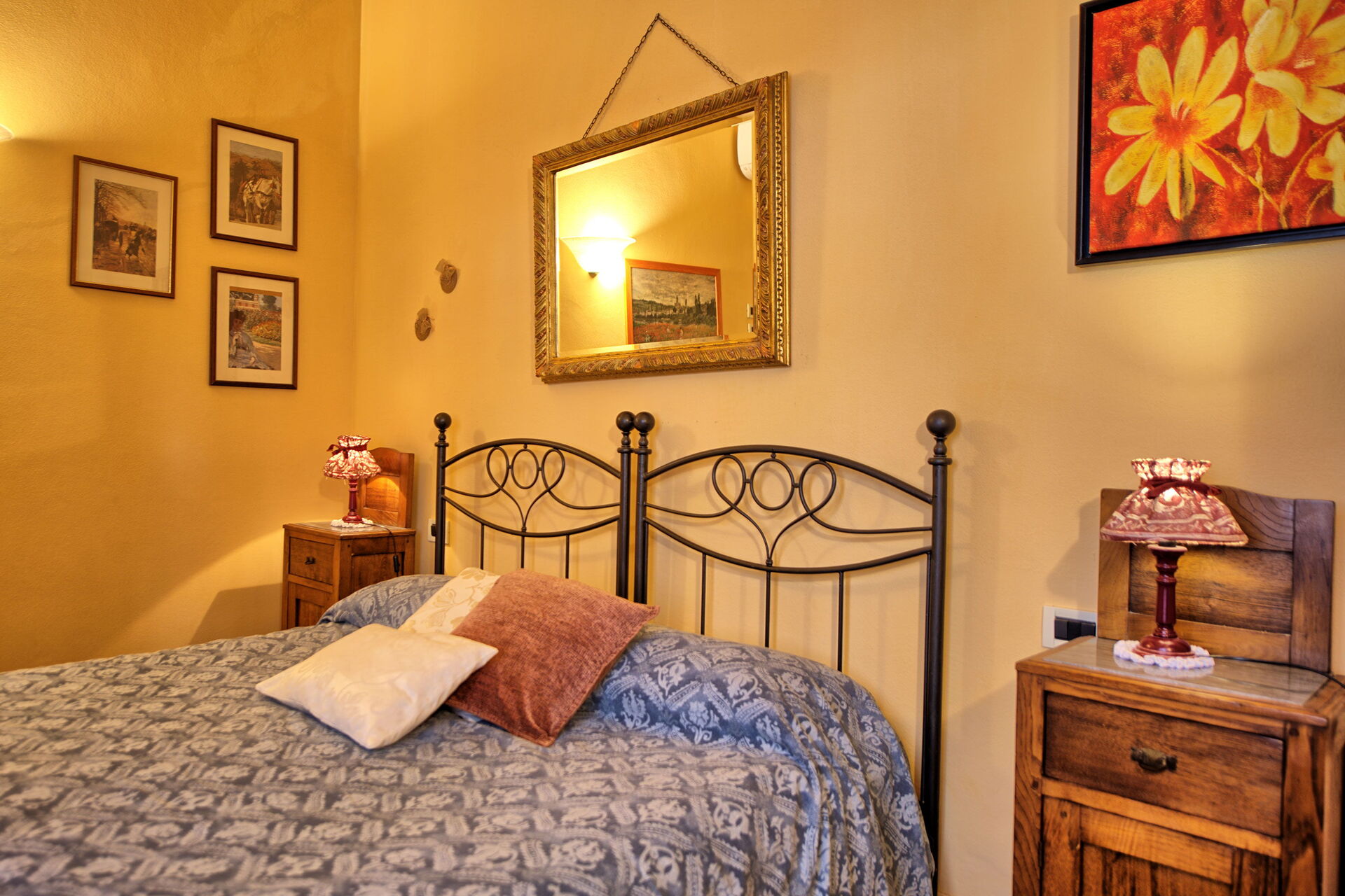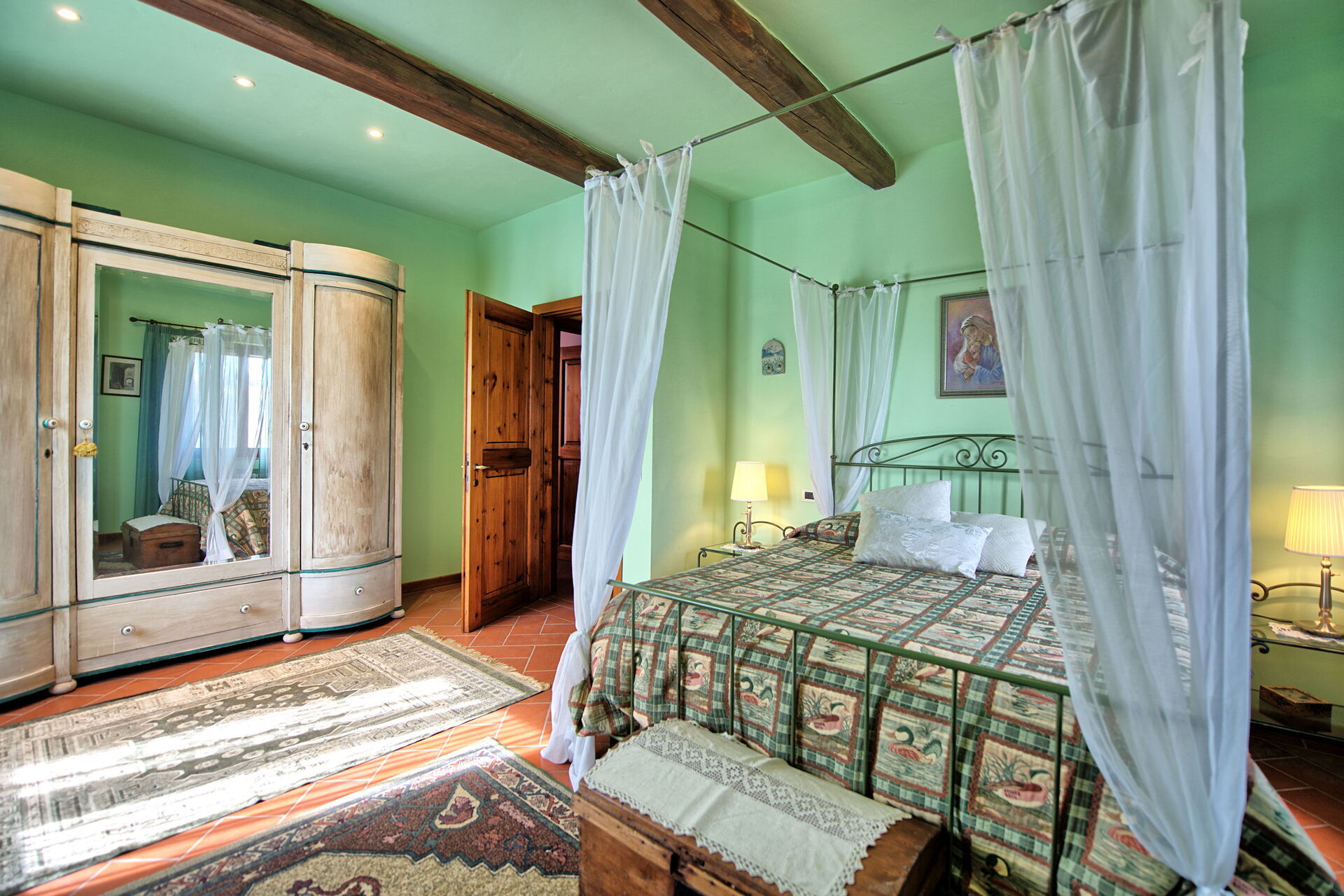 1° Piano: camera matrimoniale (aria condizionata) con letto a baldacchino, camera con 2 letti singoli (aria condizionata, letti unibili su richiesta), bagno con doccia.